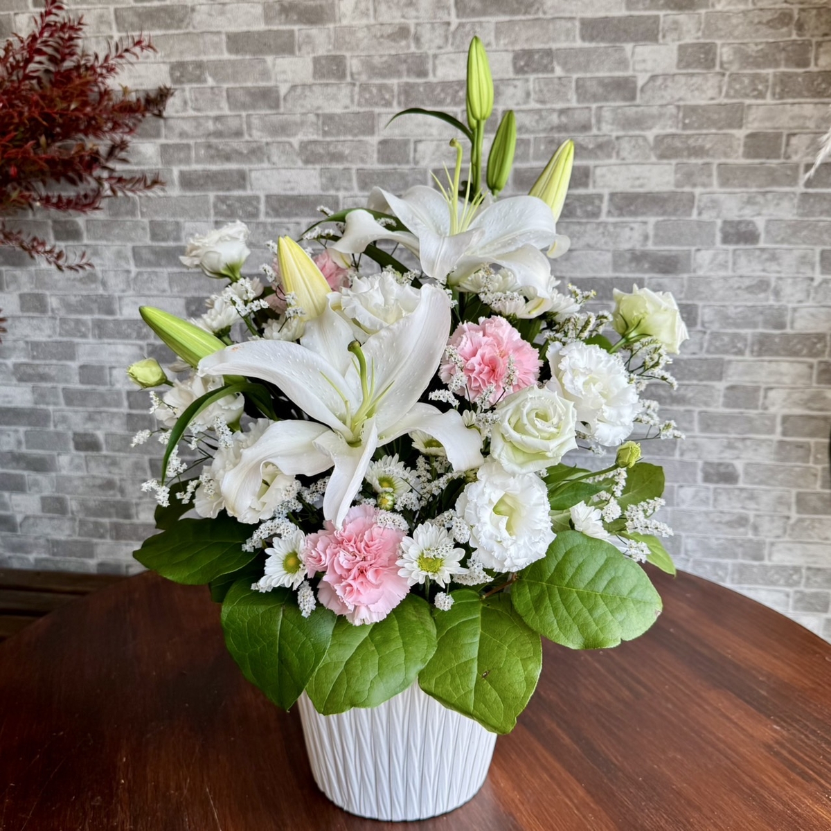 白ユリを基調にしたお供えアレンジメント。