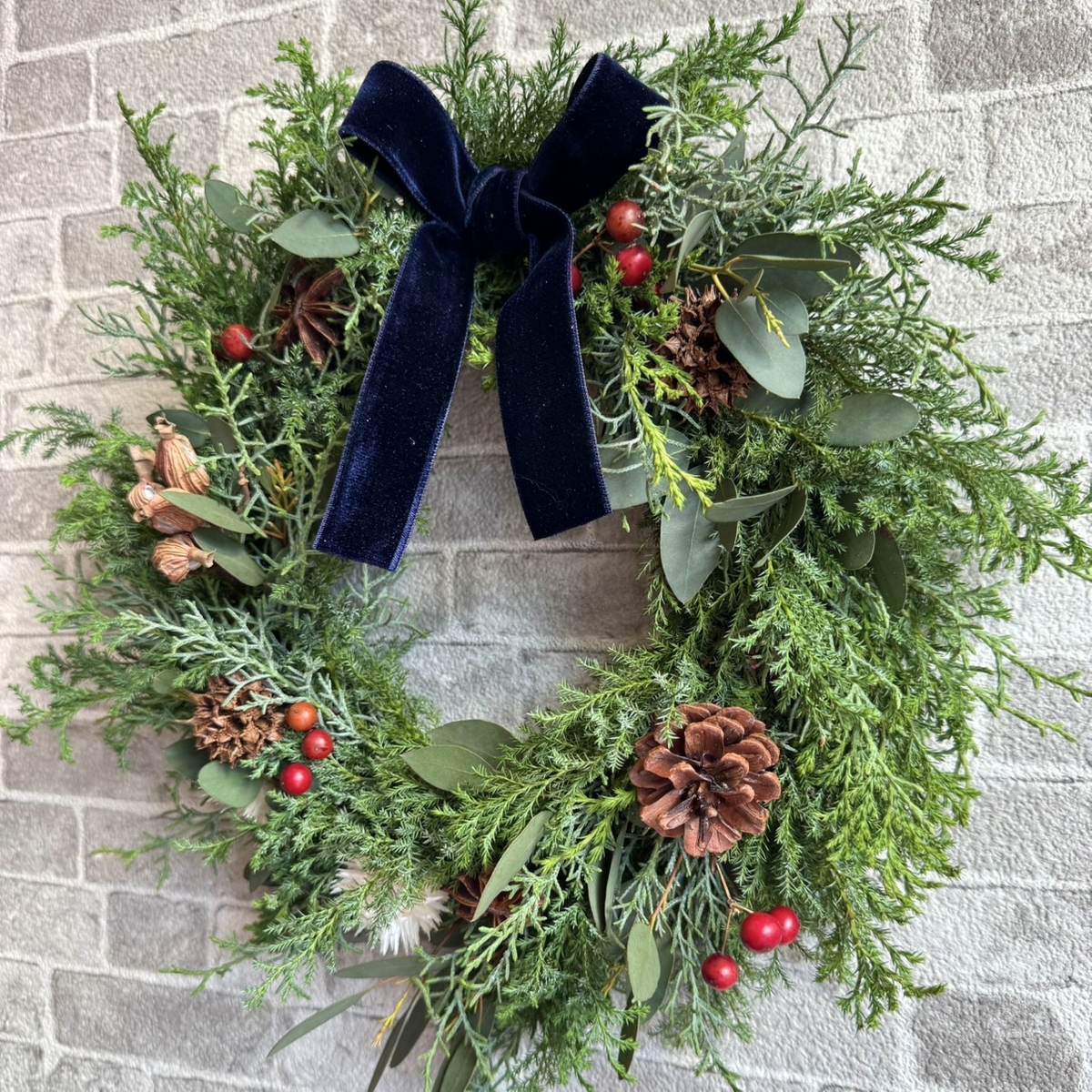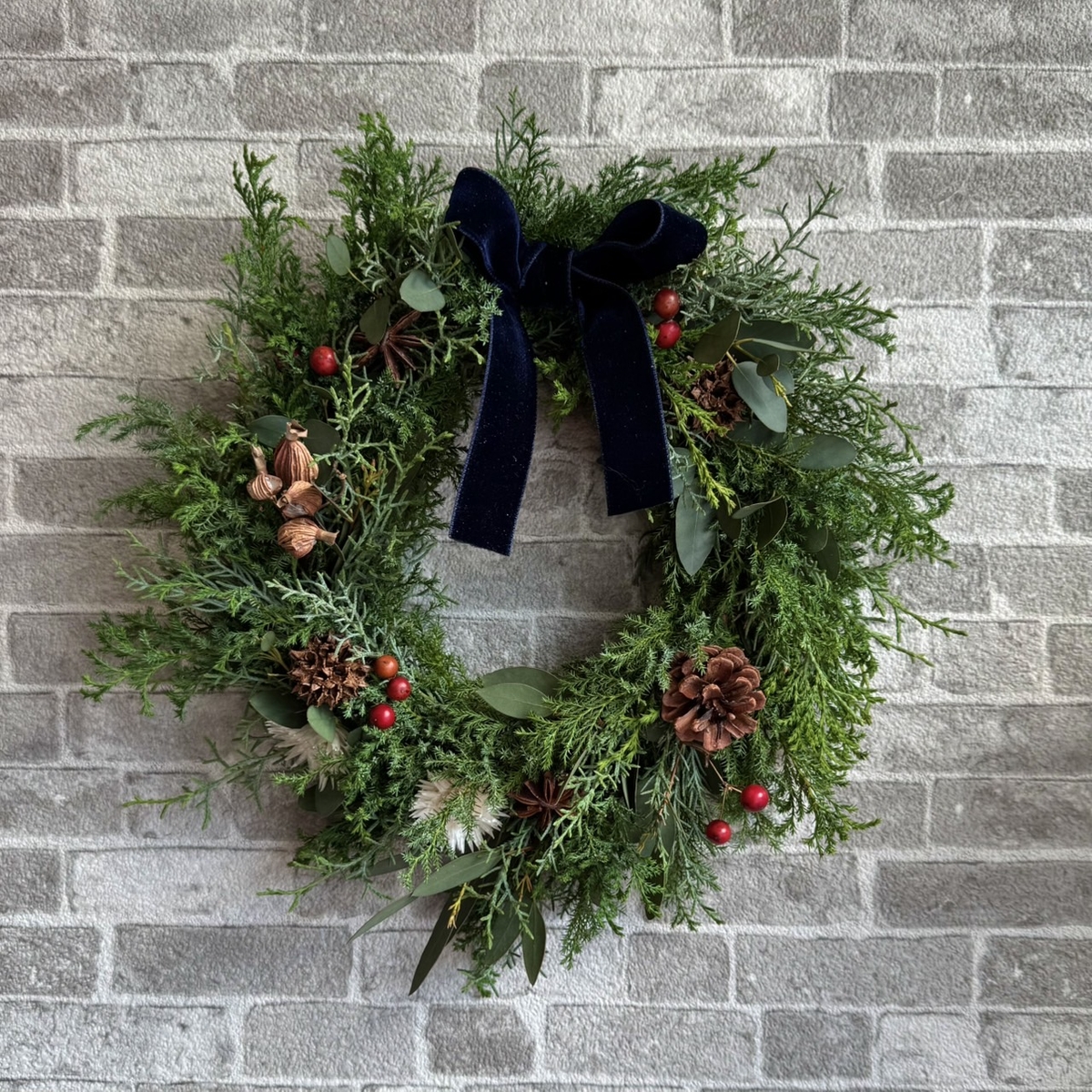 フレッシュな針葉樹と木の実を使ったオリジナルのクリスマスリース。