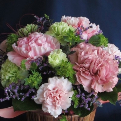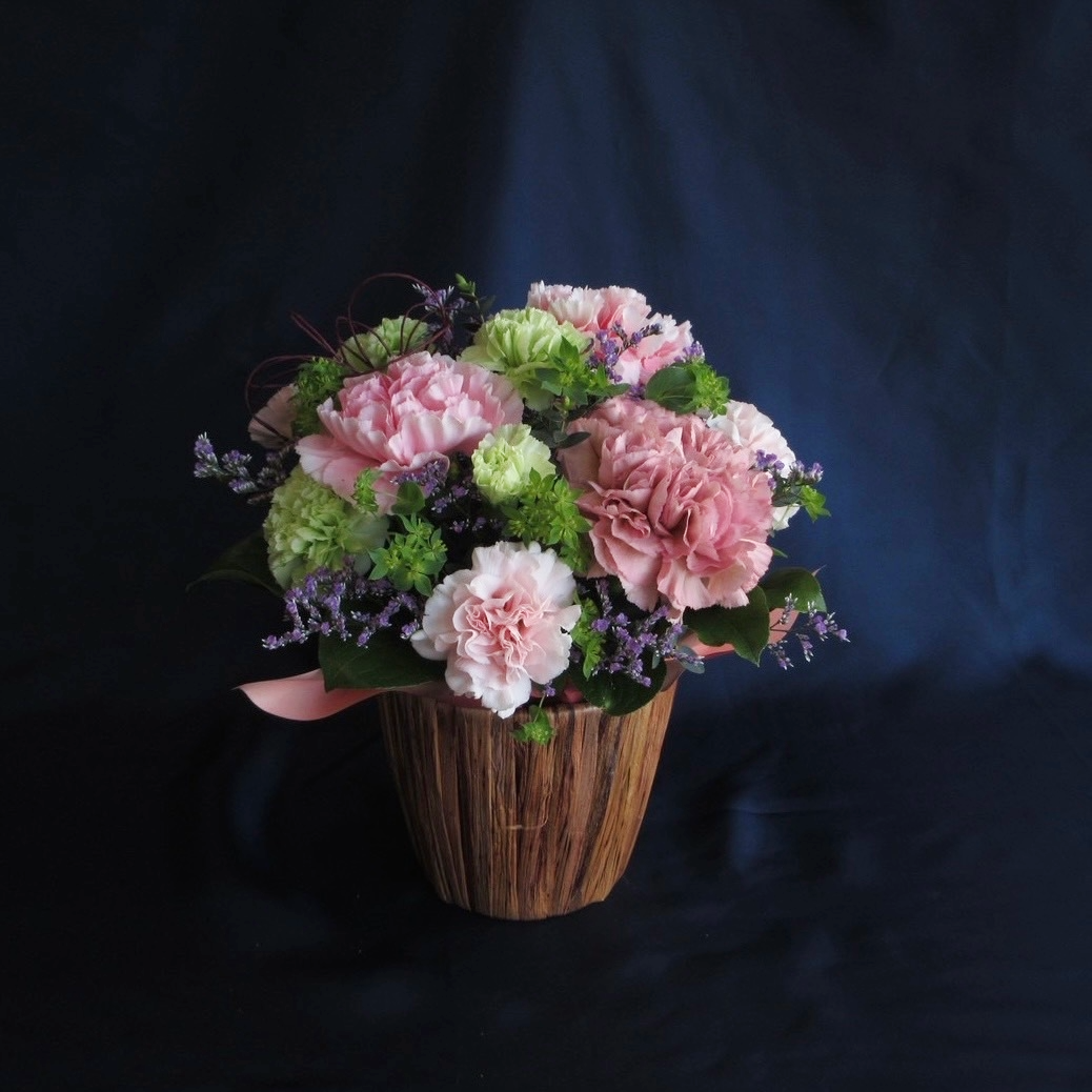 キュートなイメージのカーネーションがメインの愛らしいアレンジメント。コンパクトサイズなので、ちょっとしたスペースでもお楽しみ頂けます。